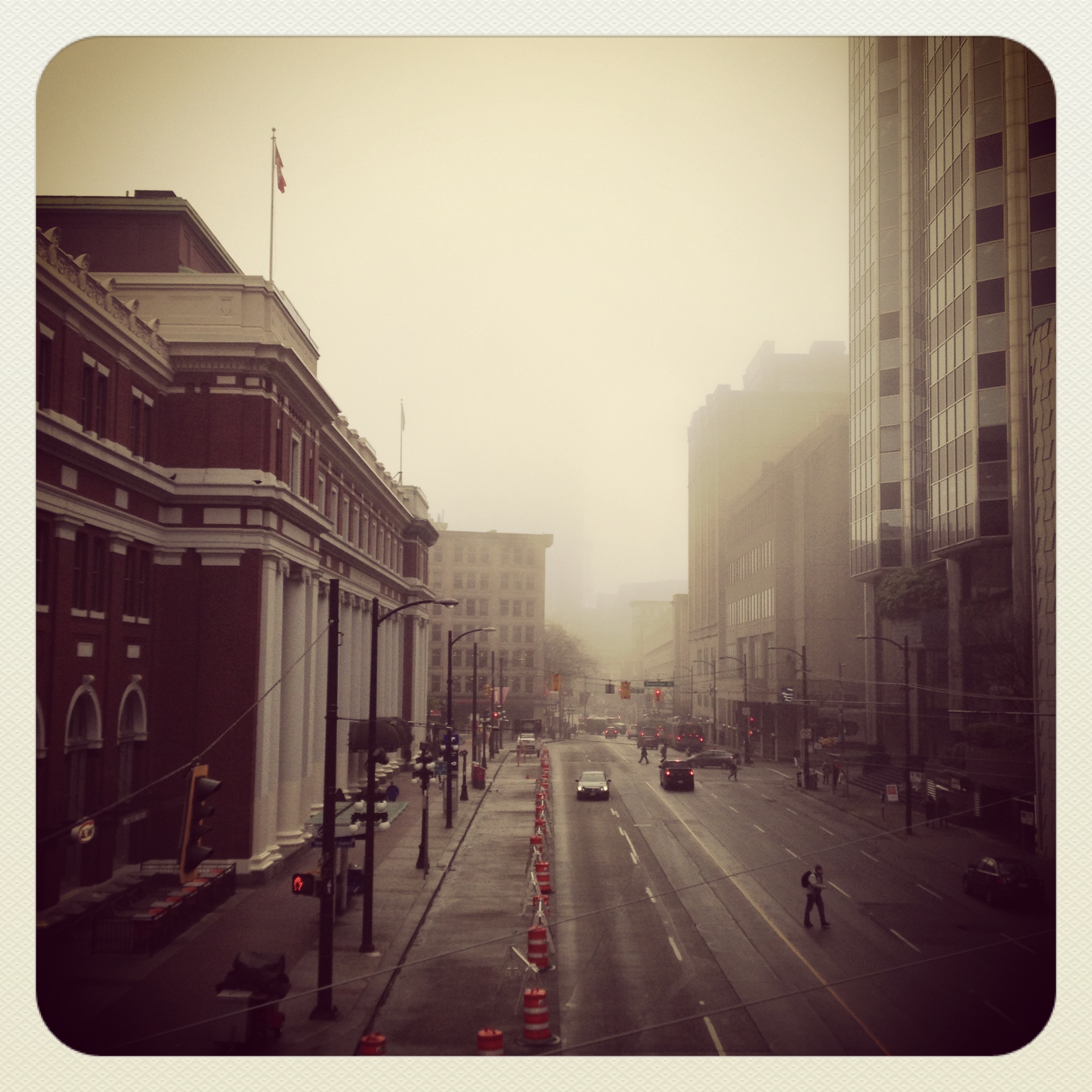 That time that Vancouver was engulfed in a fog. It was a hauntingly beautiful, for it stayed like that longer than a week. From morning to night fall and all through the night, it just stayed.