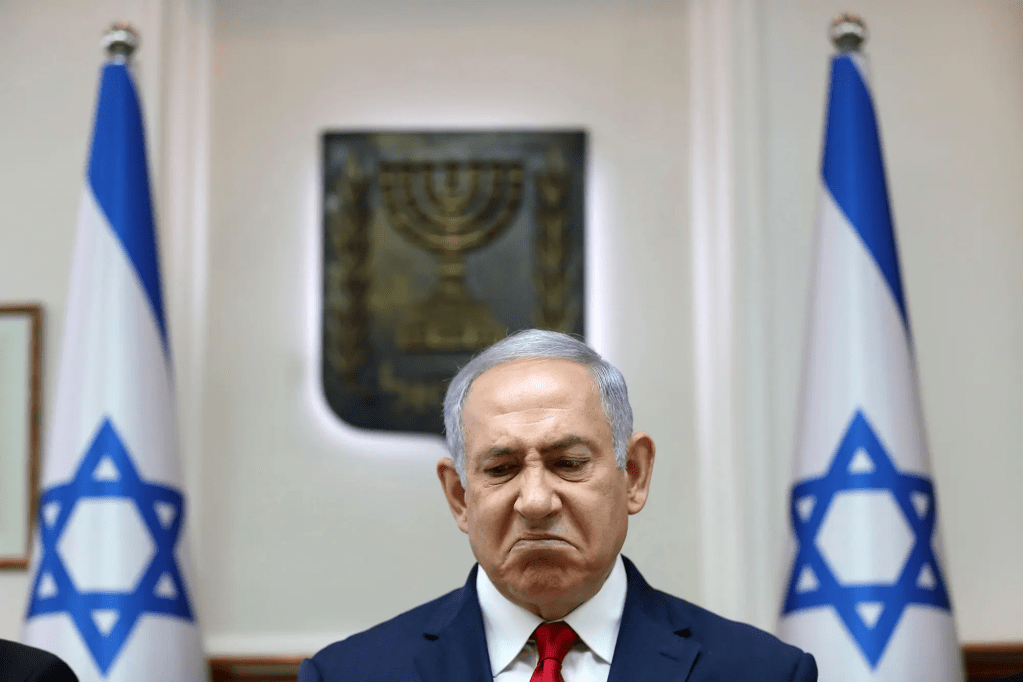 The next day he stands at a podium, two cones designed to look like the Israel flag behind him, the curtain indicates it’s surprisingly windy in the basement of the Prime Minister’s office.